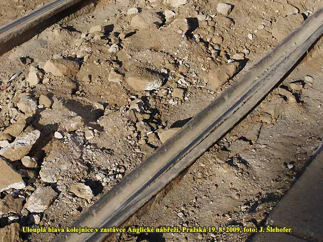 Sjetá a ulouplá hlava kolejnice v zastávce Anglické nábřeží, Pražská 19. 8. 2009 Zoufalý stav kolejiště v Pražské ulici a U Zvonu dal o sobě vědět. V polovině července se začala uloupávat oježděná hlava kolejnice v zastávce Anglické nábřeží, Pražská. Tramvaje zde tak jezdily prakticky v žlábku po okolku. Na opravu došlo konečně v noci z 20. na 21. 8. 2009, kdy byly koleje v délce cca 18 metrů vyměněny. O týden později proběhla výměna stejně dlouhého úseku i na koleji ve směru do centra.