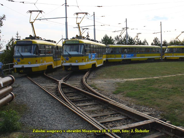 Záložní soupravy odstavené v Mozartovce 28. 9. 2009 Během celého víkendu byla tedy část provozu odřízlá od vozovny a tramvaje tak v noci stály na konečných. V obratišti Mozartova pak bylo odstaveno několik záložních souprav.