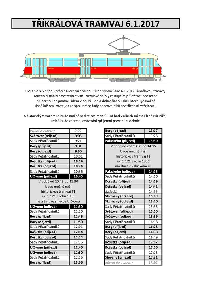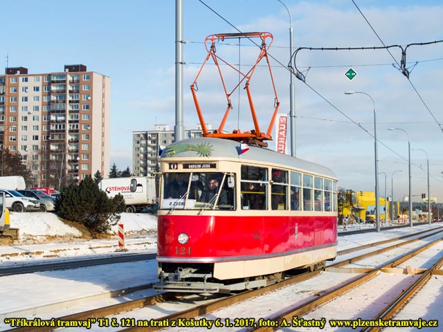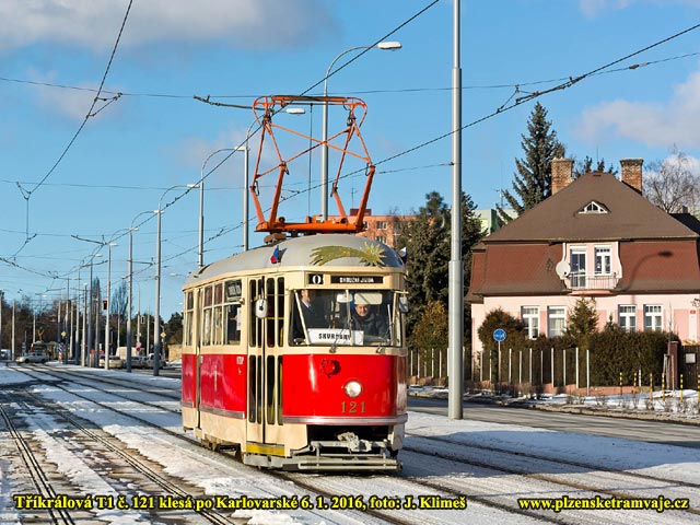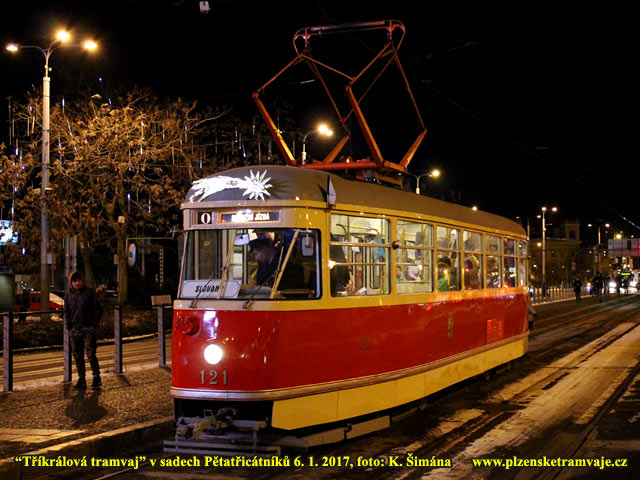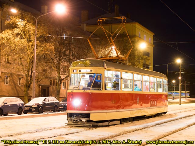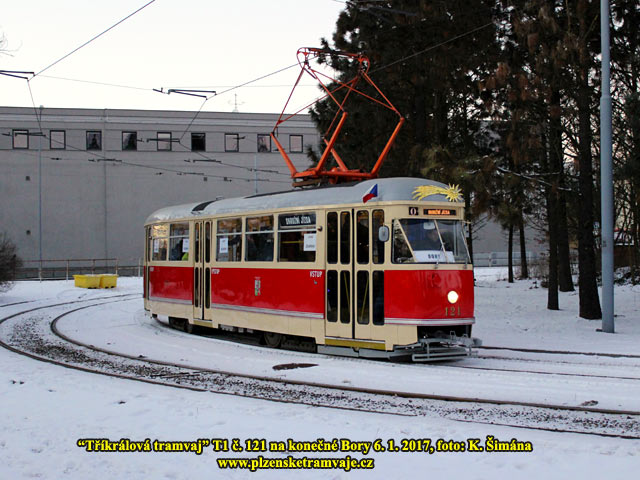 V pátek 6. 1. 2017 vyjela Tříkrálová tramvaj. Historický vůz T1 č. 121 projížděl cca mezi 9:00 - 17:30 ulicemi Plzně. Uvnitř se střídali