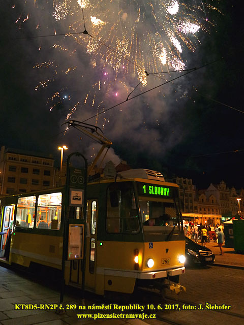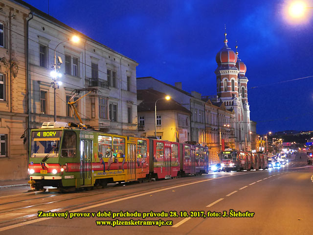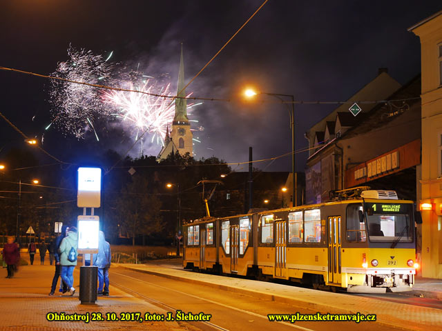 Klatovské třídě a po dobu asi 30 minut byl zastavan provoz tramvají přes náměstí Republiky v době kolem konání ohňostroje. Vozy od Slovan a