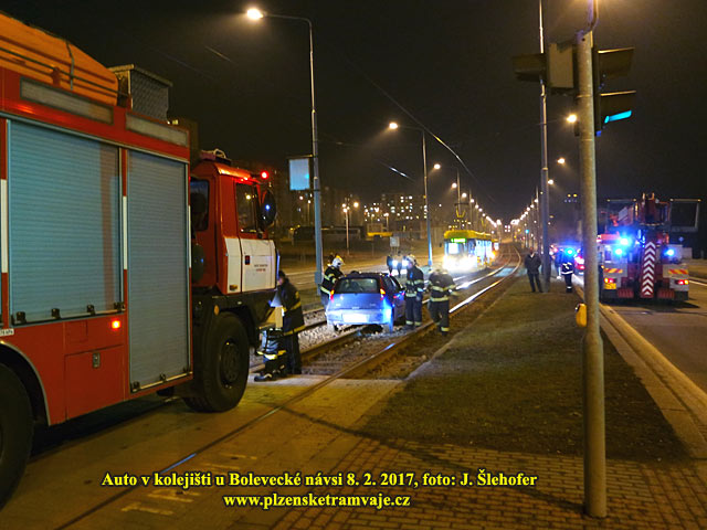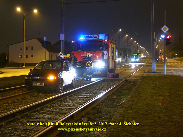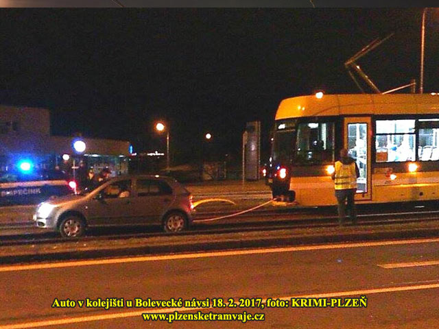 Na stejném místě, jako před deseti dny u Bolevecké návsi (viz výše), skončilo v sobotu 18. 2. 2017 cca v 18:48 opět auto v kolejišti. Duchapřítomným tramvajákům se
