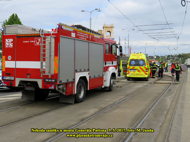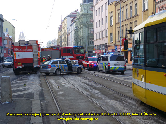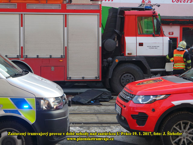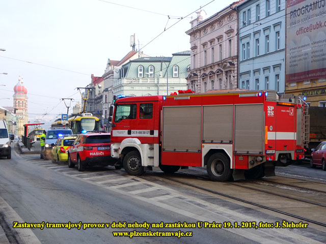 Ve čtvrtek 19. 1. 2017 krátce po devaté hodině došlo nad tramvajovou zastávkou U Práce k vážné nehodě. Hasičské auto jedoucí k případu,