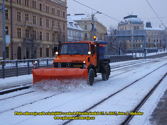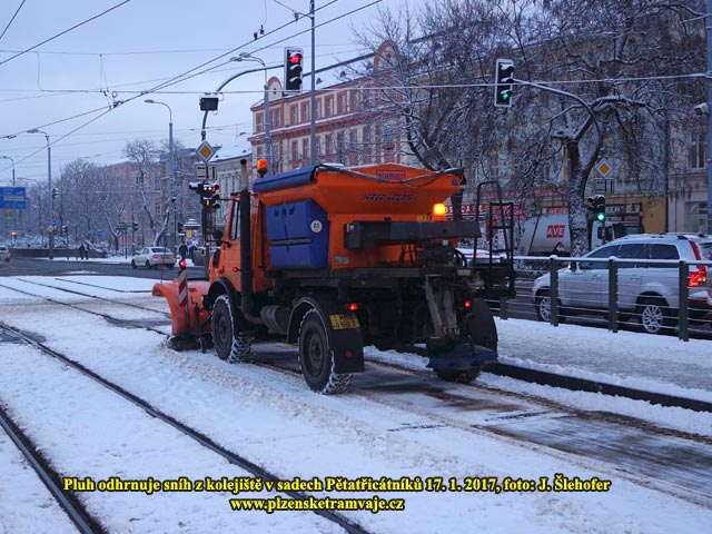 V Plzni nemáme tramvajový sněhový pluh, protože by neměl moc práce. Když však náhodou více sněhu napadne, odhrnuje tratě silniční pluh.