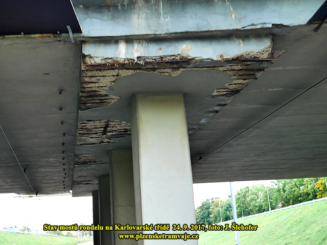 kdy je i vidět přímo nad tramvajovou tratí, jak se drolí z okolí pilířů z mostů beton. Omezení rychlosti zde tak může být bohužel zřejmě delší dobu. Již v loňském roce se