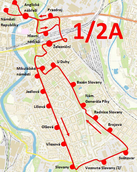 viz. výše. Drobnou změnou je to, že tramvaje linek 1X a 2X od Slovan a Světovaru končící na Mikulášském náměstí, jezdí bez cestujících na kolejovou spojku