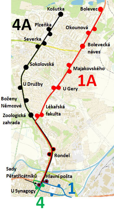 přes most nad nádražím až na náměstí Republiky. Odtud již pokračují tramvaje linek 1 a 2 do Bolevce či Skvrňan. Provoz na lince č. 4 je beze změn (s vyjímkou nezatahování vozů do vozovny Slovany).