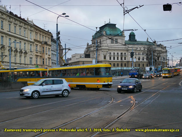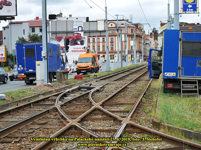 odtud couvaly před Nové divadlo. Tím se dostaly na kolej směr Skvrňany, kam zpět pokračovaly. Náhradní doprava přes centrum nebyla zajištěna, ale např. z Palackého