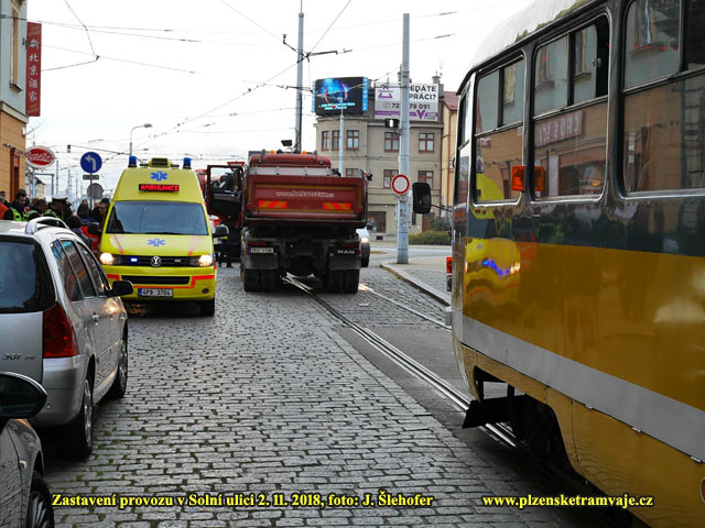 V páteční odpolední špičce 2. 11. 2018 došlo k nebezpečně vypadajícímu střetu nákladního auta s chodcem v Solní ulici. Chodec přecházel mezi stojící tramvají a