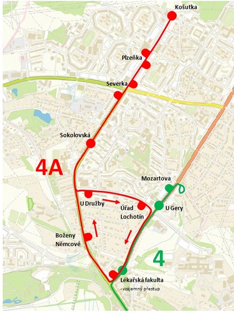 obratiště Mozartova. Od Lékařské fakulty na Košutku pak cestující pokračovali autobusy náhradní dopravy označené linkou 4A.
