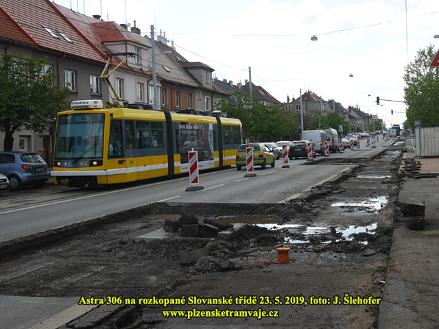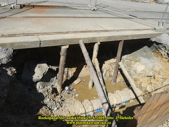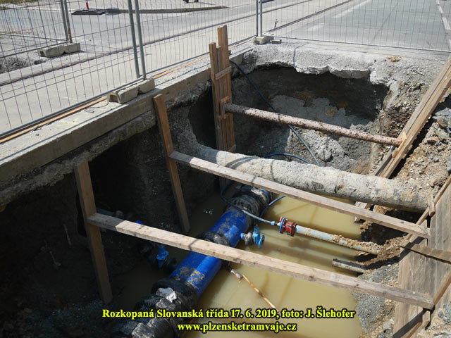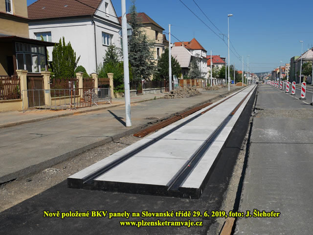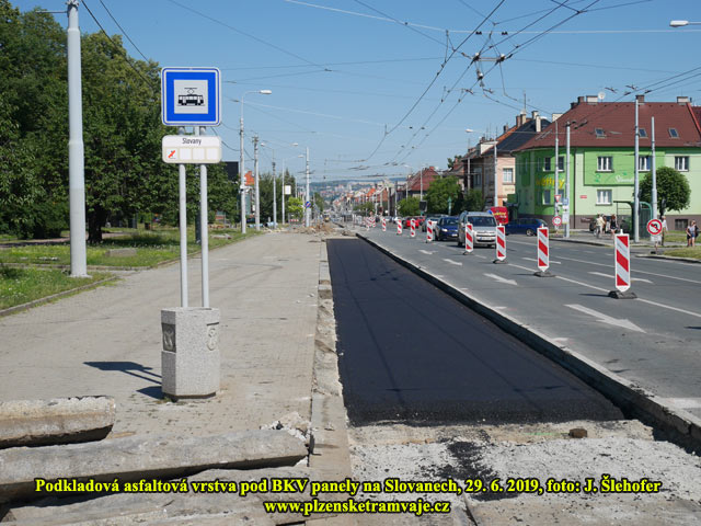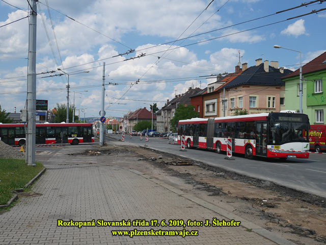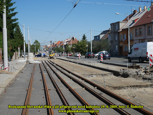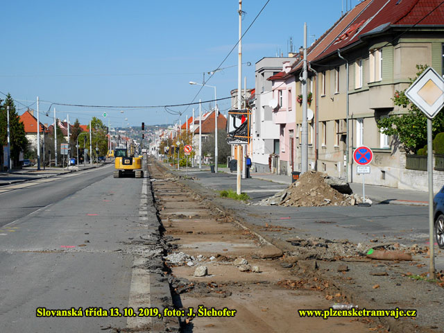 Slovanské třídy. V úseku po Olšovou se kolejiště ve směru na Slovany stejně opravovat nebude. Zde byly panely měněny