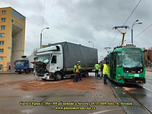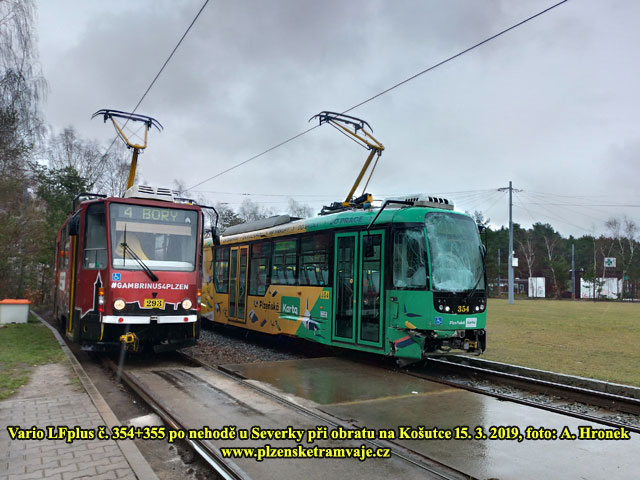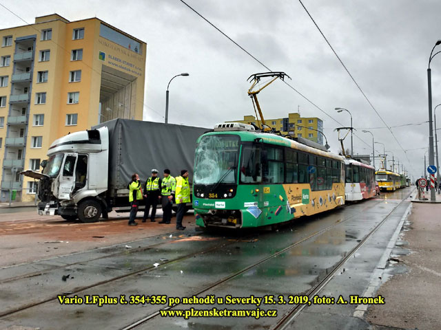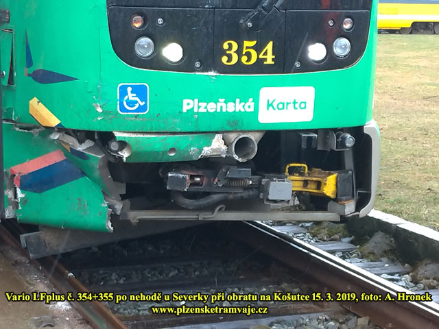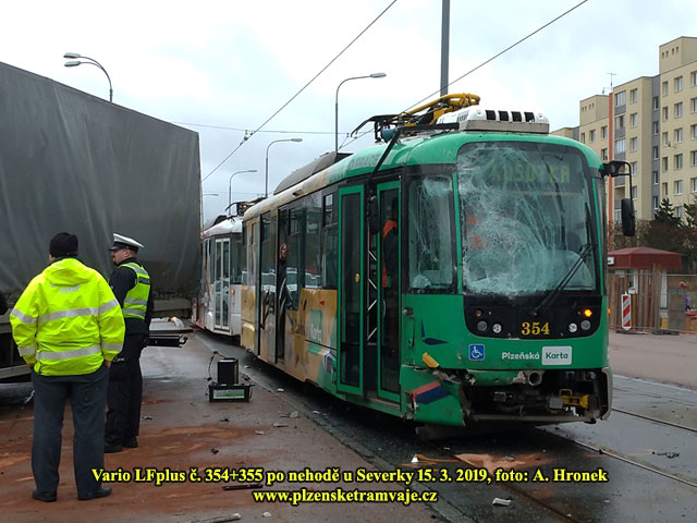 V pátek 15. 3. 2019 došlo na křižovatce u Severky cca ve 12:20 k nehodě soupravy tramvají Vario LF plus č. 354+355 s