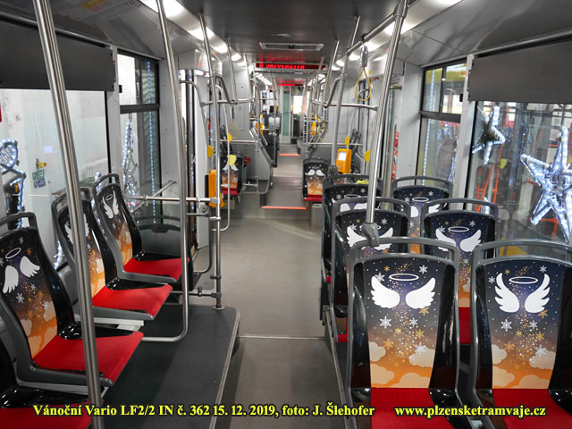 Stejně jako loni jde o Vario LF 2/2 IN č. 362. Polep je letos v jiné barvě, ale hlavně přibyla i výzdoba interiéru. V ulicích města
