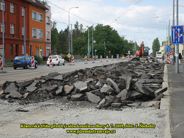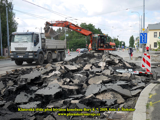 Borská Pole. Po prvním týdnu výluky došlo k rozbití asfaltového povrchu na Klatovské třídě.