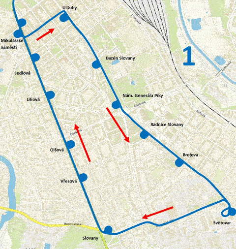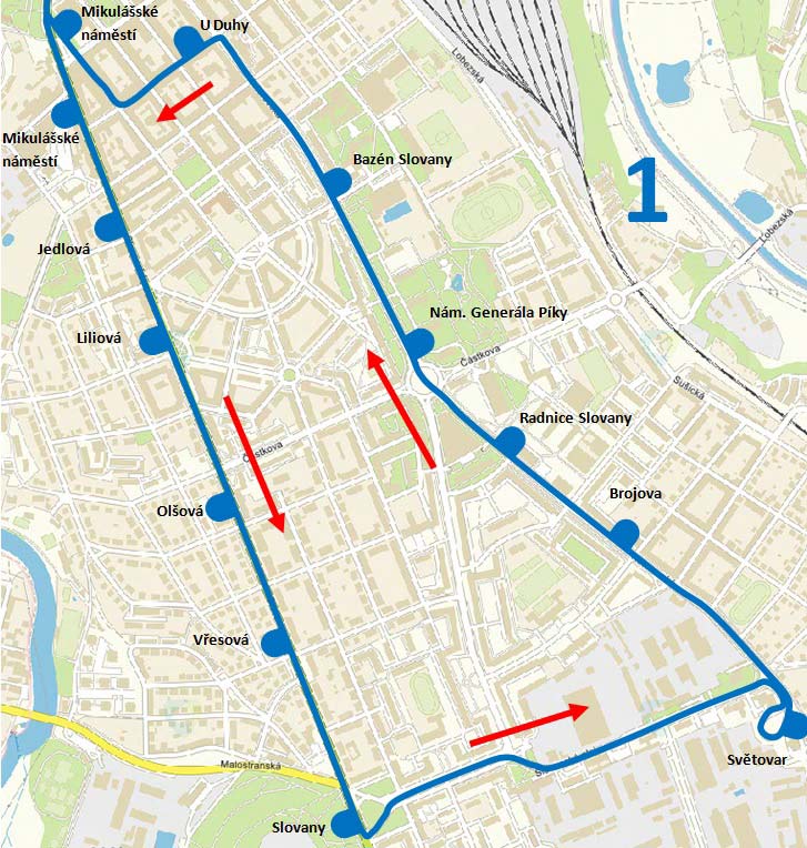 po manipulační trati kolem vozovny na Slovany. Odtud do centra pak již jednička pokračuje po své trase po Slovanské třídě.