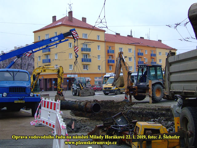 Místo opravy vodovodu leží přímo pod sjezdovou výhybkou na náměstí Milady Horákové.