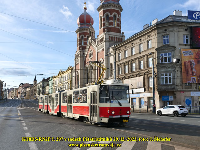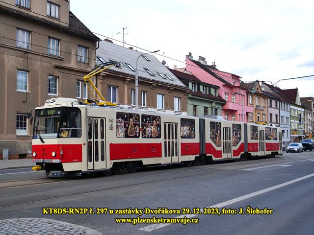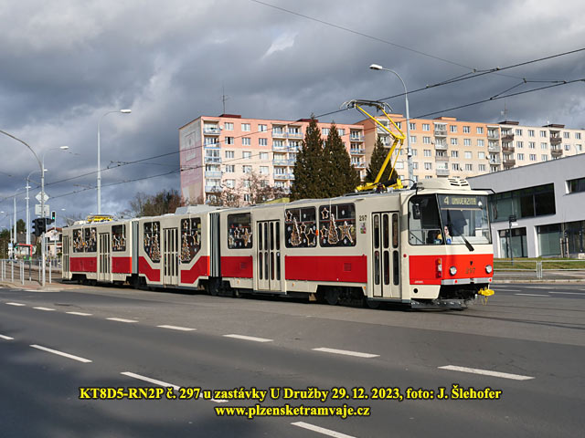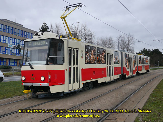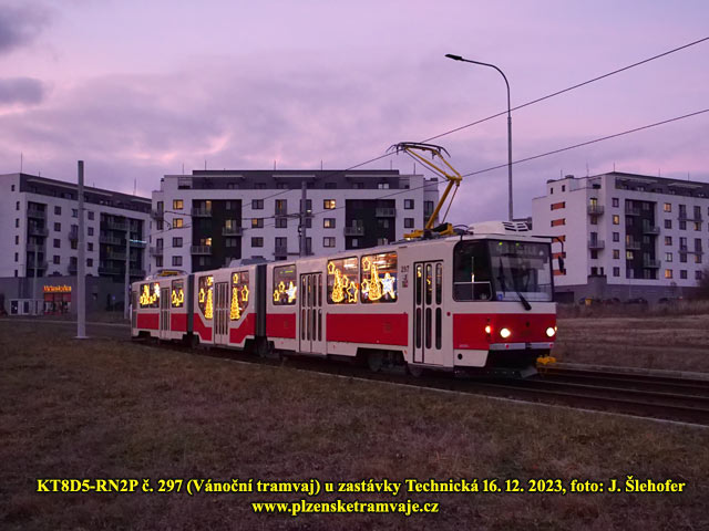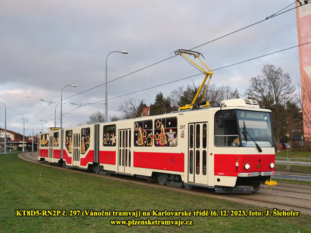 Do pravidelného provozu již výše zmíněný vůz KT8D5-RN2P č. 297 vyjel 15. 12. 2023. A protože došlo k něšťastné nehodě letošní vánoční tramvaje (40T č. 386),