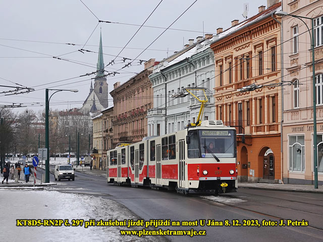 Na první zkušební jízdu vyjel 6. 12. 2023 vůz KT8D5-RN2P č. 297. Vůz během tzv. velké prohlíkdy (tedy údržby vyššího stupně) dostal v dílnách na Karlově