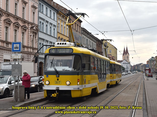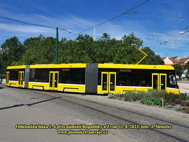 Tramvaje na lince č. 4 se rozjíždí po 12:30. Protože náměstí Republiky je nadále uzavřené, tramvaje od Skvrňan a Bolevce se od té doby obrací v sadech Pětatřicátníků.
