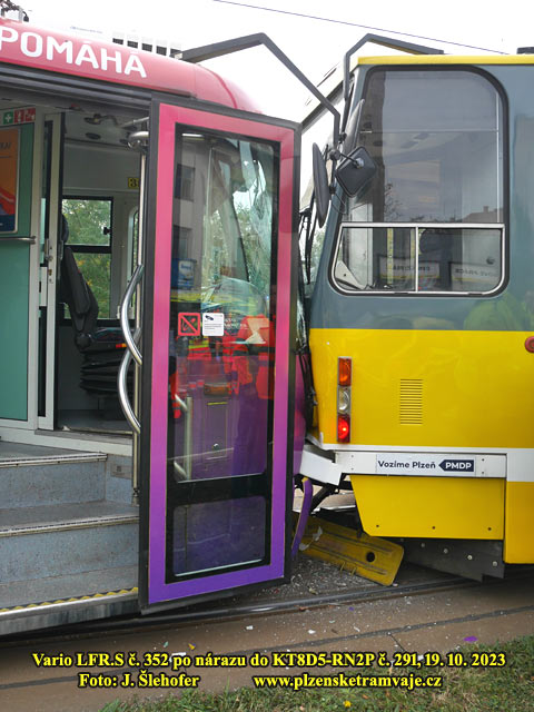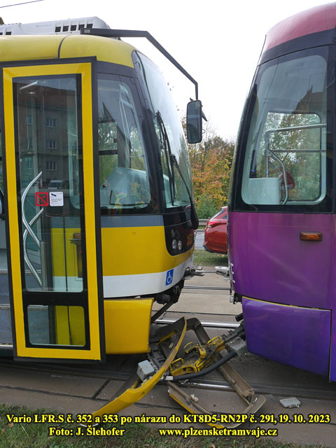 Při nehodě bylo bohužel zraněno skoro třicet osob. Naštěstí by mělo jít jen o lehčí zranění. Z tramvají jsou poškozena nejen čela sražených vozů 352 a 291 (foto vlevo), ale došlo také k poškození spřáhel mezi vozy soupravy 352+353 (foto vpravo).