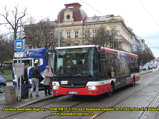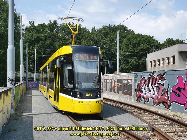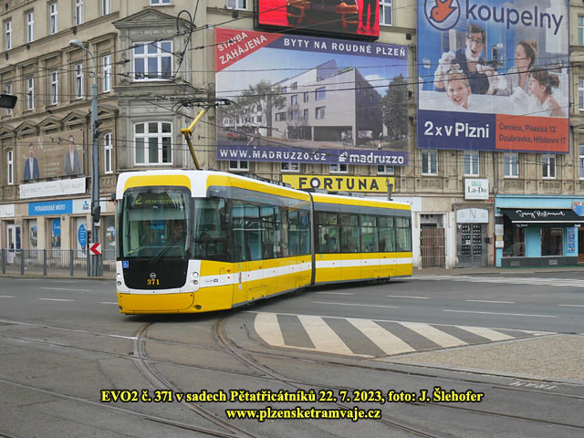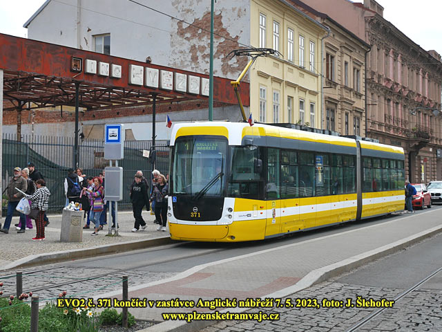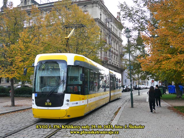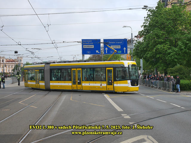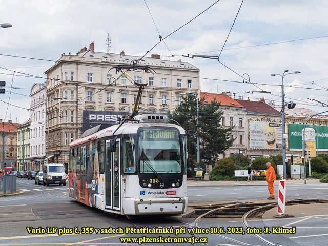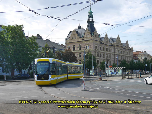 vlevo zpět Skvrňany. Přestup je tedy v sadech Pětatřicátníků na dvojku na opačném nástupišti. Díky rekonstrukci v ulici Terezie Brzkové však