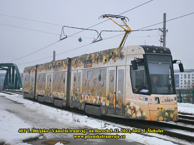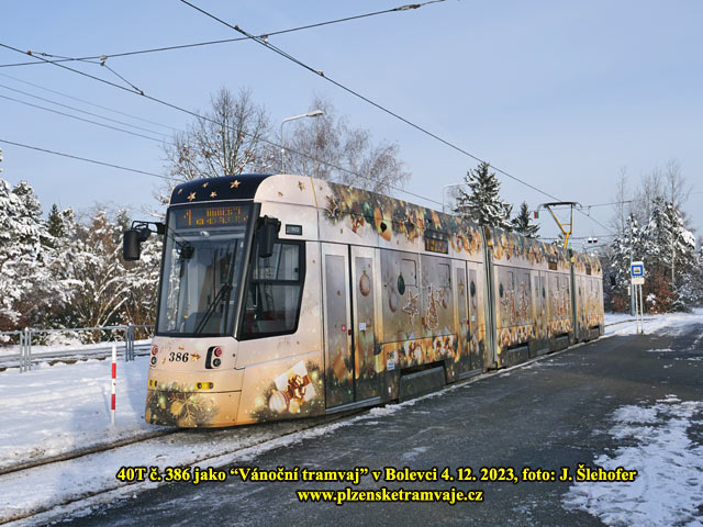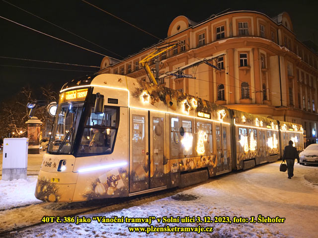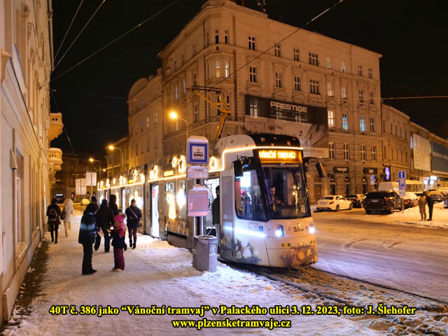 Jako letošní "Vánoční tramvaj" vyjíždí 40T č. 386. V neděli 3. 12. 2023 kroužila večer na zvláštních jízdách z Palackého ulice kolem centra a od pondělí 4. 12. 2023 je