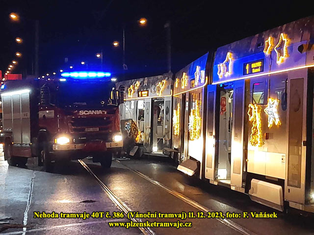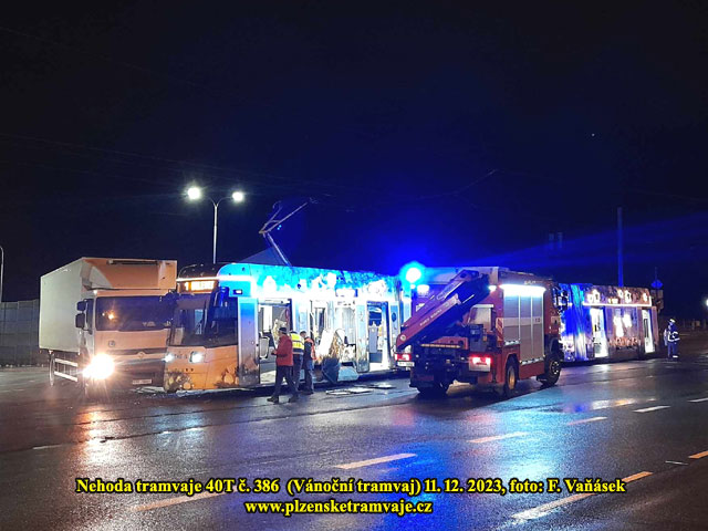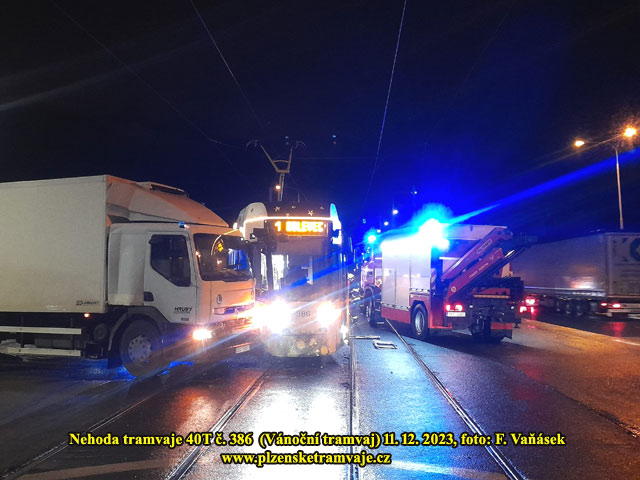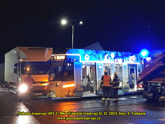 V pondělí 11. 12. 2023 krátce po páté hodině ranní došlo ke střetu nákladního vozu se 40T č. 386, tedy s letošní vánoční tramvají. Nehoda se stala na