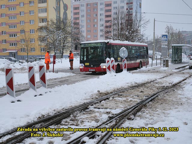 Technická závada na povrchové úvraťové výhybce na náměstí Generála Píky se však projevila během nedělního dopoledne 3. 12. 2023. Došlo k odlomení části jazyka a