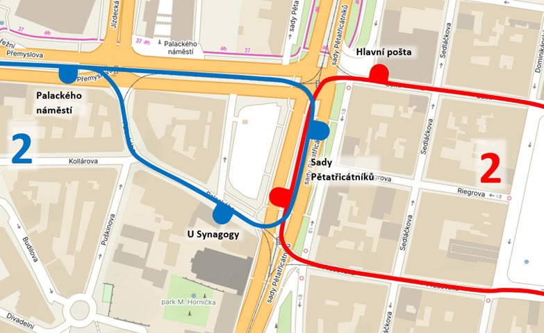 Linky 1 a 4 ze severu objíždějí dotčený prostor přes Palackého náměstí a Palackého ulicí k synagoze a dál po svých trasách.