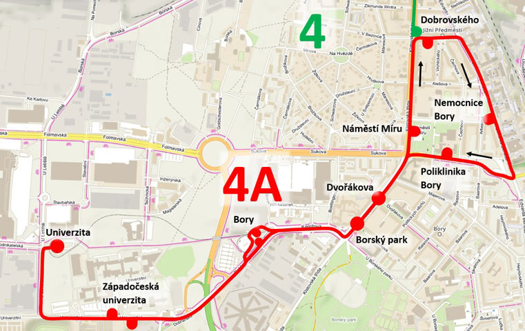 Cestující směřující na Bory si musí přestoupit na autobus náhradní dopravy linky 4A jedoucí z Dobrovského ulice.
