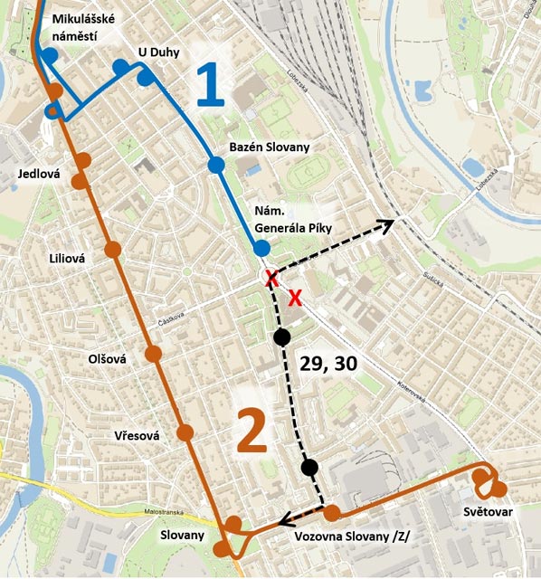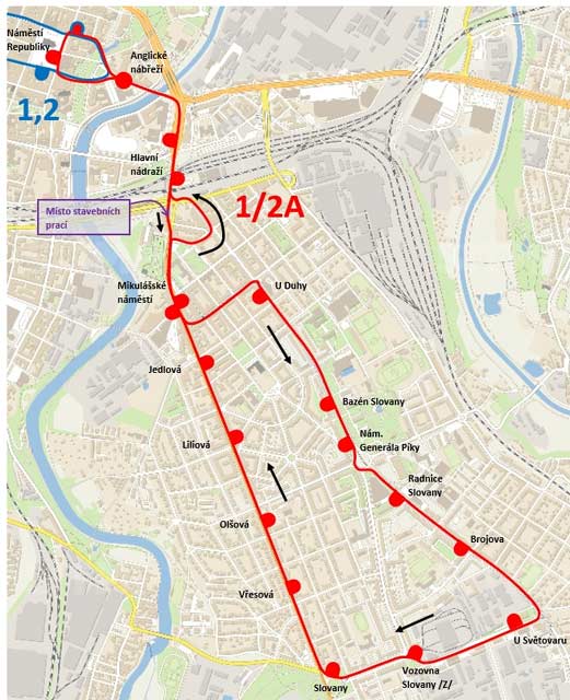tramvajový provoz sem musel být zastaven. Linka č. 1 je od Bolevce ukončena již na Mikulášském náměstí, kde se otáčí běžně nepoužívaným obloukem ze