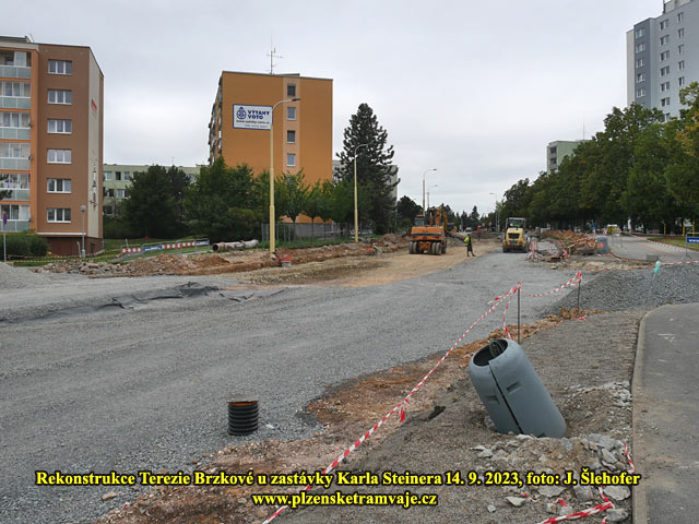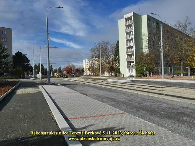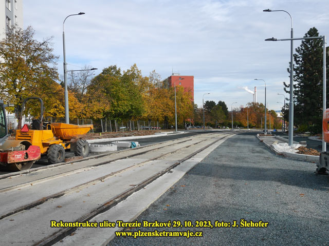 Ve Skvrňanech v rekonstruovaném úseku ulice Terezie Brzkové jsou již kromě kolejí také usazené obrubníky a zbývá tak dodělat povrchy. Začátkem listopadu