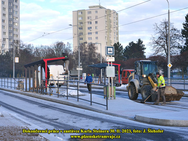 V poslední den výluky do Skvrňan probíhají na místě ještě poslední dokončovací práce. Montovány jsou například přístřešky v zastávce Karla Steinera.