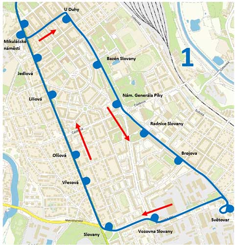Linka č. 2 z Malesické je pak směřována po Slovanské třídě na Slovany a dále Slovanskou alejí na Světovar.