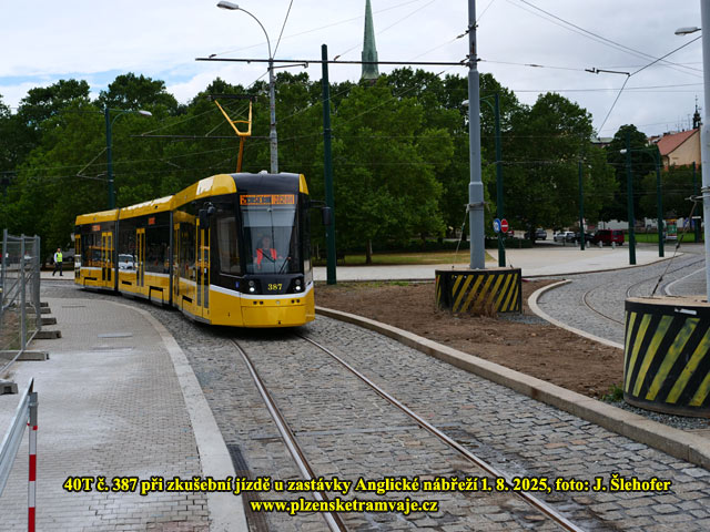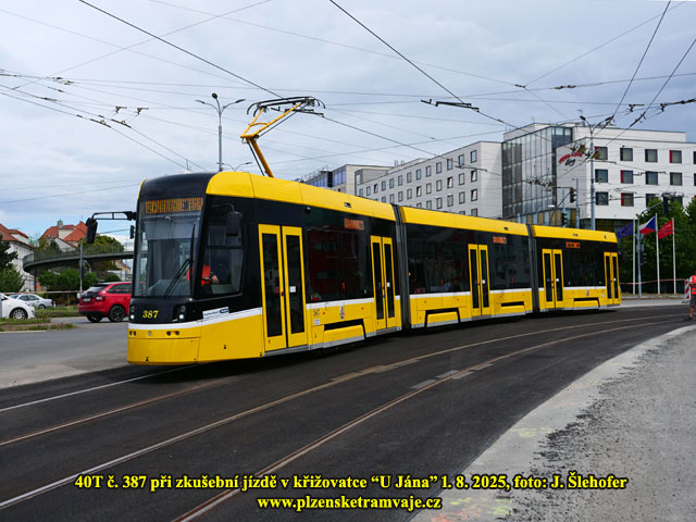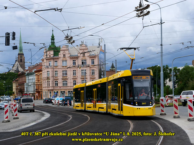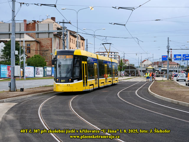 V pátek 1. 8. 2025 odpoledne proběhla již zkušební jízda tramvaje po rekonstruované trati U Jána. Jak je ze snímků patrné zkušebním vozem byla 40T č. 387.