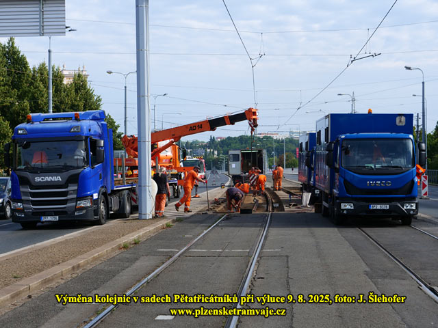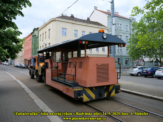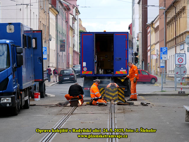 V Radyňské ulici probíhaly práce na opravě kolejiště poblíž sjezdové výhybky tratí z obou směrů od Sladkovského ulice. Na snímku vpravo je také zachycena zatlačovačka gumy kolem kolejnic do BKV panelů, která zde na svůj výkon v Radyňské ulici teprve čeká.