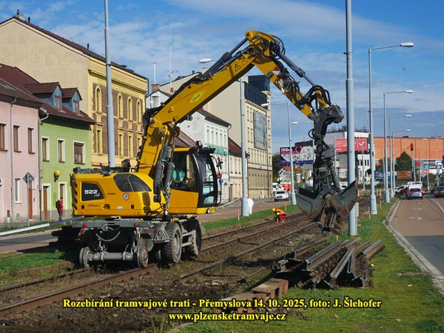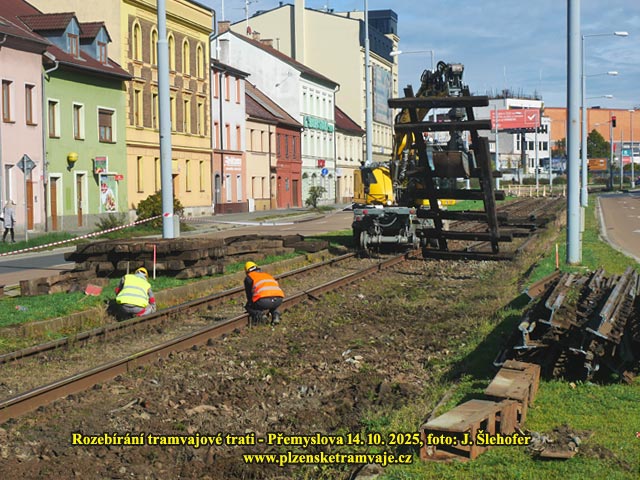 Na většině rekonstruovaného úseku je sneseno trolejové vedení. Zatím však zůstává na Palackého náměstí. A hned v prvních dnech je rozebírána tramvajová trať. Kolejnice jsou přepálené a bagry pak místy zvedají celá kolejová pole a místy kolejnice z pražců hned vytrhávají.