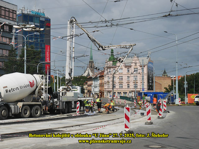 V oblouku U Jána roste rychle nové kolejiště, tvořené tzv. pevnou jízdní dráhou. Na betonové desce je postavena a uchycena konstrukce kolejiště. Kolejnice jsou polepené pryžovými bokovnicemi. Následně je vše zalité betonem.
