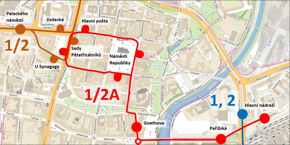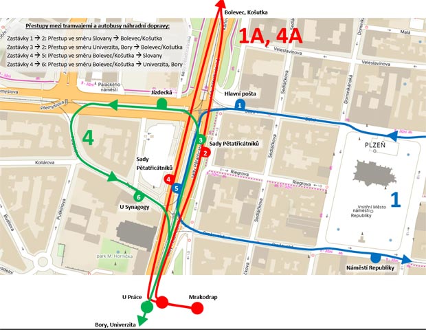 Přes centrum města krouží autobusová náhradní linka 1/2A (ze sadů Pětatřicátníků od synagogy, přes náměstí Republiky na Anglické nábřeží, k nádraží a po Americké zpět do zastávky U Práce a k synagoze). Tramvaje od Skvrňan a Bolevce se točí v sadech Pětatřicátníků přes Palackého ulici. Linka č. 4 jezdí ve své stálé trase.
