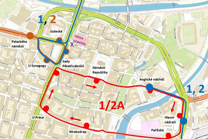 Mezi Hlavním nádražím a Sady Pětatřicátníků je pak zavedena náhradní autobusová doprava. Linka označená 1/2A jede po Americké, Goethovou a Františkánskou ulicí a přes náměstí Republiky. Z důvodu již výše uváděných stavebních pracích také na Anglickém nábřeží, tak tuto zastávku míjí.
