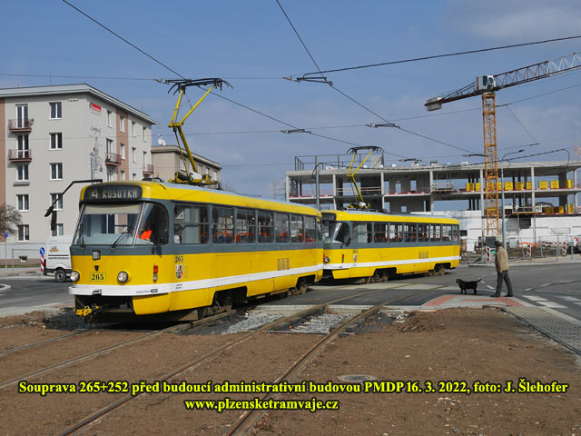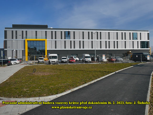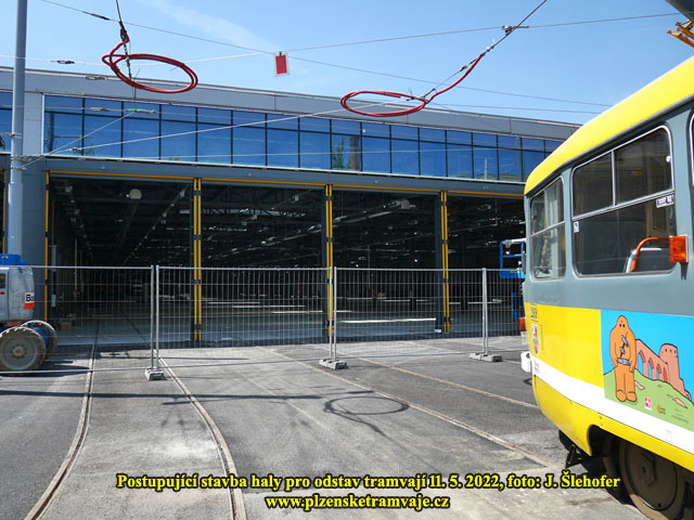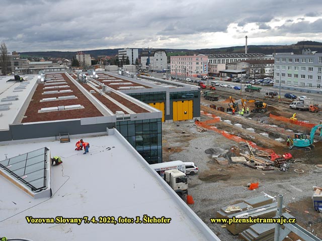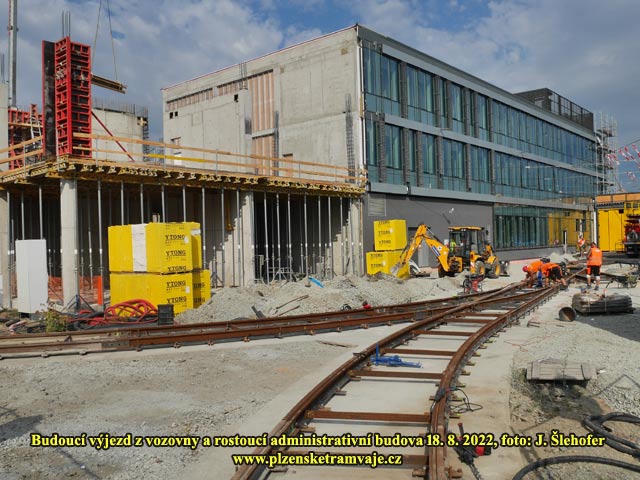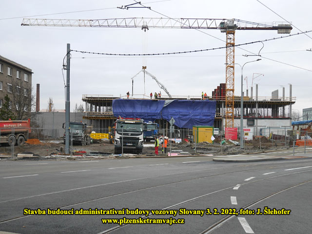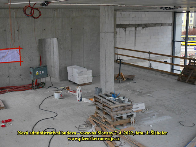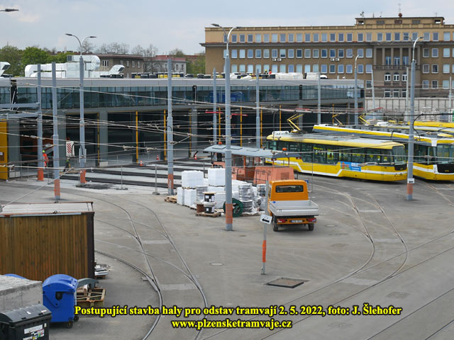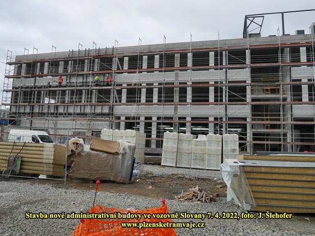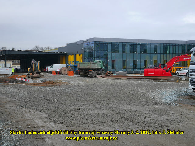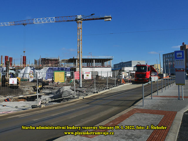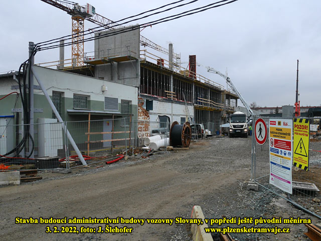 Jak je patrné i z předchozích snímků, začátkem roku 2022 již viditelně roste také nová administrativní budova vozovny. Vedle ní ještě stojí dosud používaná měnírna.