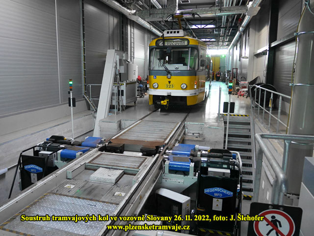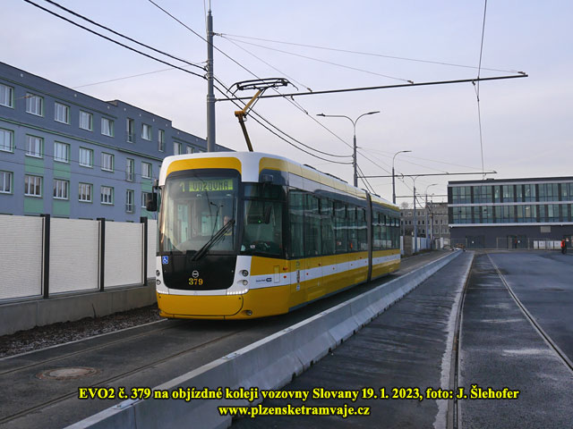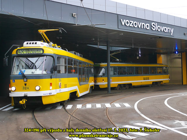 Dne 16. 2. 2023 byl pak nad výjezdem z hal namontován nápis "vozovny Slovany". Na snímku pod ním právě souprava 324+196 vyjíždí z haly denního ošetření, kudy projíždí jednou denně všechny tramvaje po návratu z linky.
