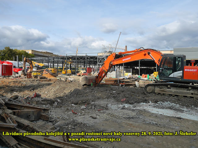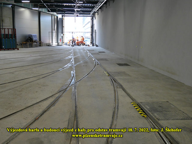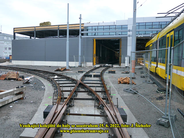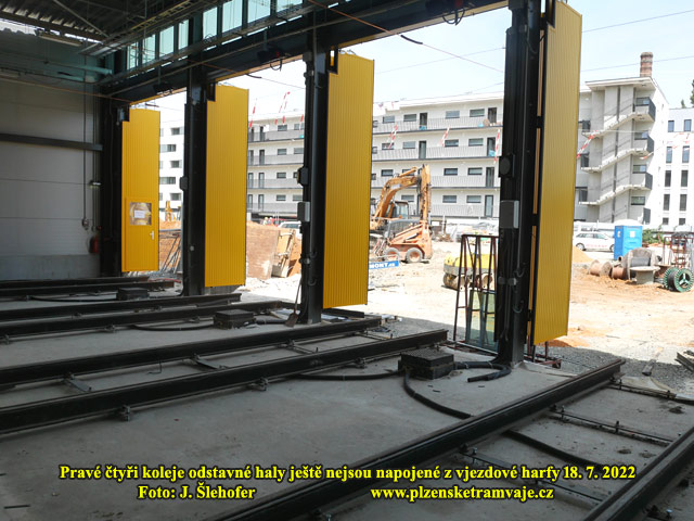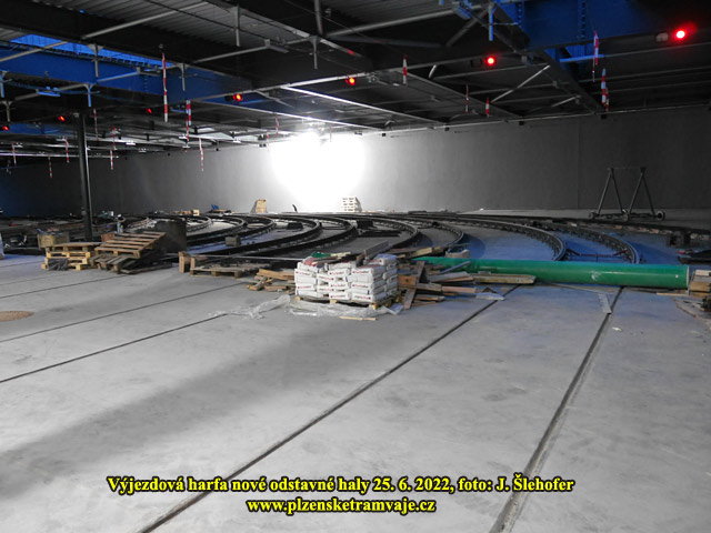 V této části vozovny je již vystavěna nová kolejová harfa se začátky kolejí směřujícími k nové hale a napojena je kolejově také provizorní