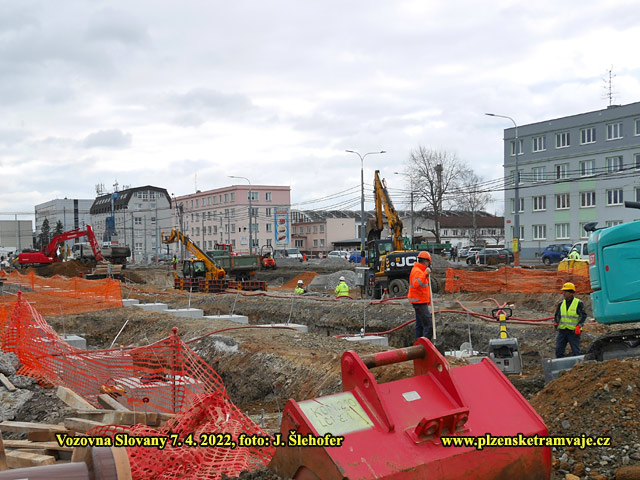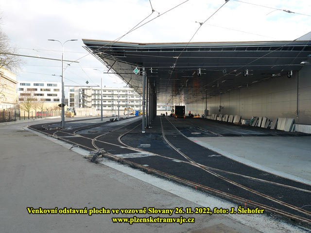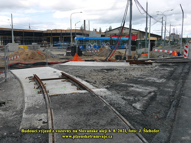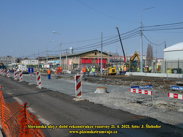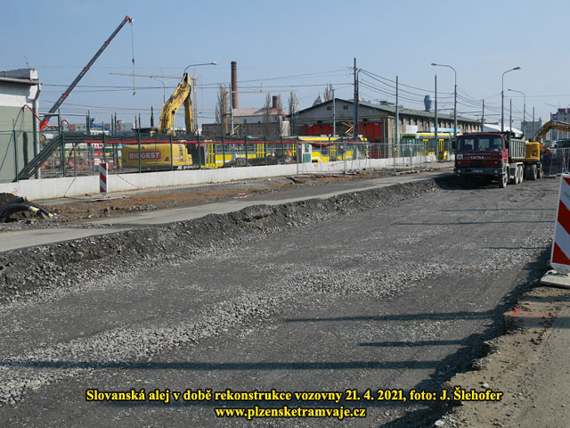 Kromě areálu vozovny probíhají práce také v jejím sousedství na Slovanské aleji. Jde o rekonstrukci trati, ze které budou vystavěny nově vjezd a v zadní části vozovny pak výjezd.