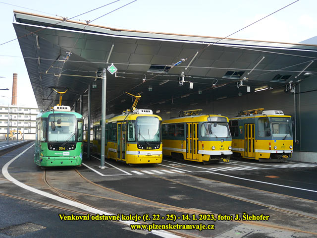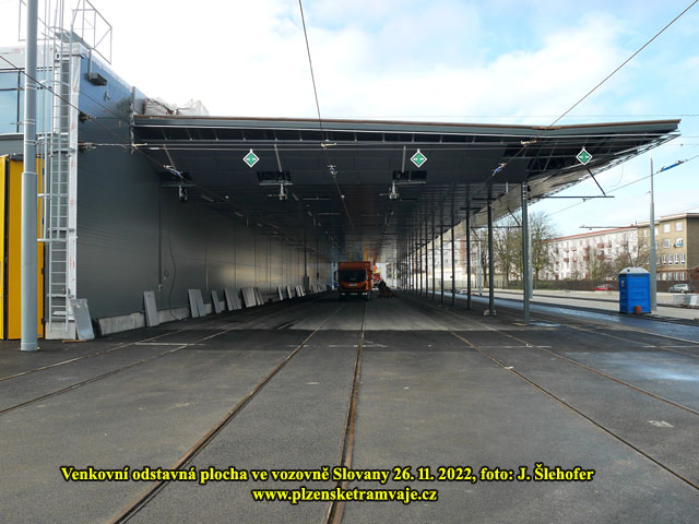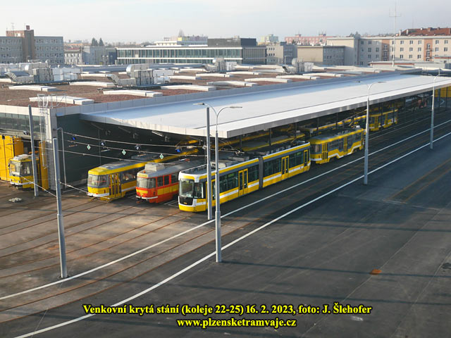 Funguje již také venkovní zastřešený odstav. Na snímku jsou vozy na kolejích (zprava) č. 22, 23, 24 a 25. Koleje 22 a 23 nejsou na této straně napojené, jsou tedy slepé,