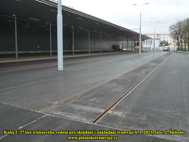Vlevo od těchto vozů je ještě objízdná kolej č. 26 a pak kusá kolej č. 27 bez trolejového vedení pro případné nakládání vozů na trajler pomocí jeřábů.