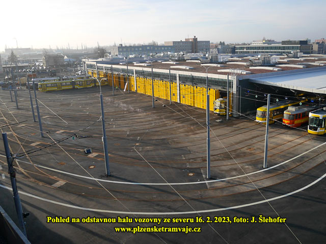 Zde na obrázcích z poloviny února 2023 je pohled na halu odstavu ze severní strany. Vpravo je pak kryté venkovní stání (koleje 22-25) a objízdná kolej 26.