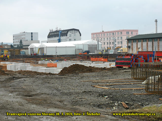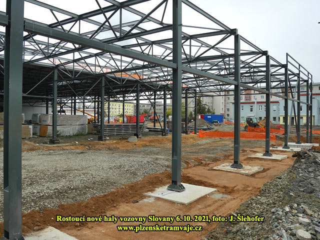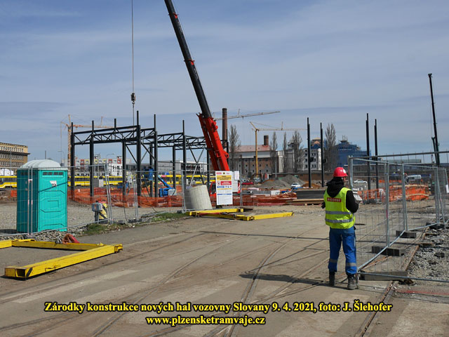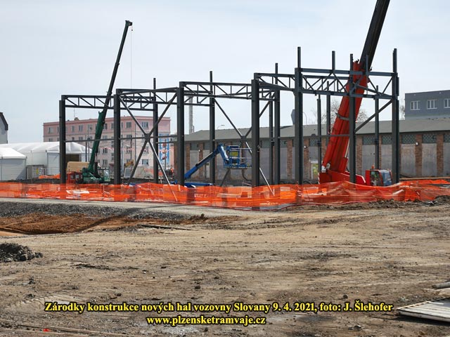V dubnu 2021 v areálu vozovny na betonových základech rostou již zárodky konstrukce nových hal.