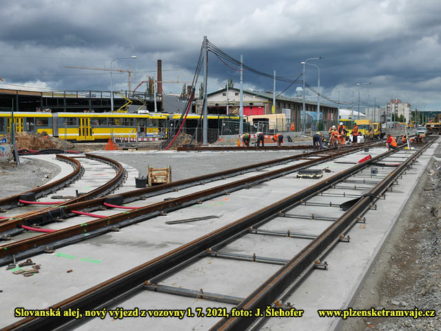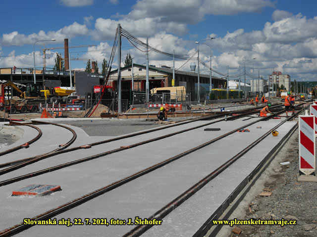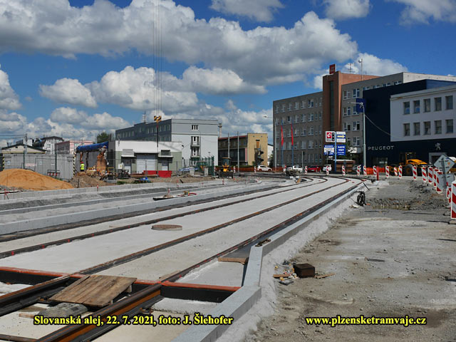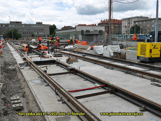 Následující obrázky z července 2021 ukazují postupující práce na Slovanské aleji. Na betonové desce je položeno nové kolejiště. Kolejnice jsou obložené protivibračními