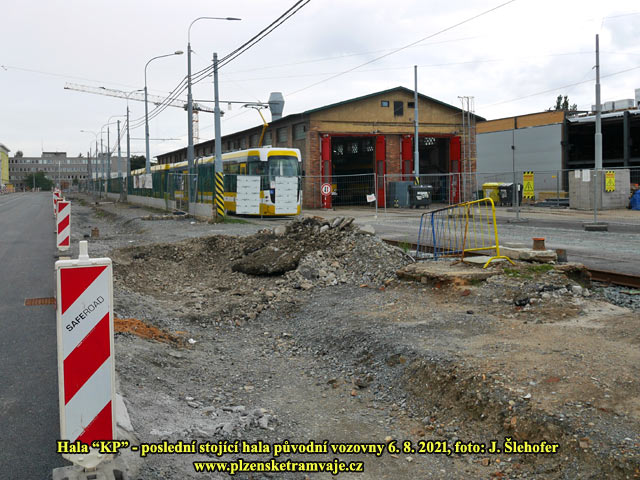 vjezdem od Světovaru. Ven pak tramvaje vycouvávají. Zcela vpravo stojí s červenými vraty ještě poslední z původních hal, tzv. KP, nebo-li hala kontrolních prohlídek.