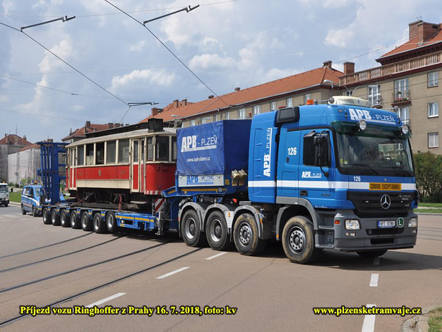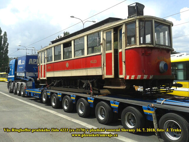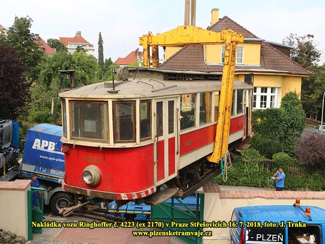 Nakládka vozu Ringhoffer č. 4223 z depozitáře muzea ve Střešovicích 16. 7. 2018, foto: J. Trnka Ten není kolejově propojen s muzeem, ani s tramvajovou sítí a vyjmutí vozu z něj nebylo úplně jednoduché. K převozu došlo v pondělí 16. 7. 2018. Po složité nakládce byl pak na tahači APB přivezen do vozovny na Slovanech, kde již byl spuštěn na plzeňské koleje.